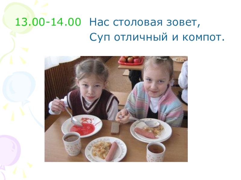 13.00-14.00 Нас столовая зовет,          Суп отличный и компот.
