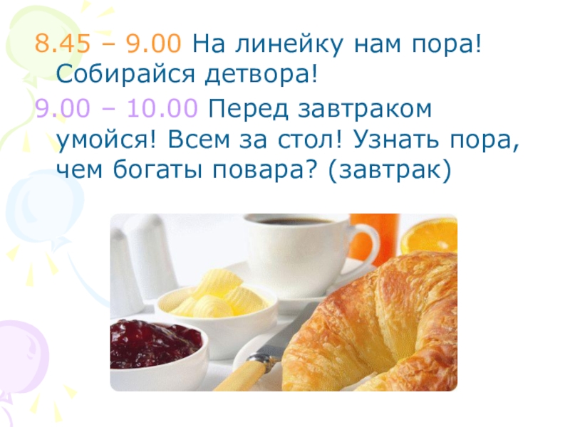 9.00 – 10.00 Перед завтраком умойся! Всем за стол! Узнать пора, чем богаты повара? (завтрак)