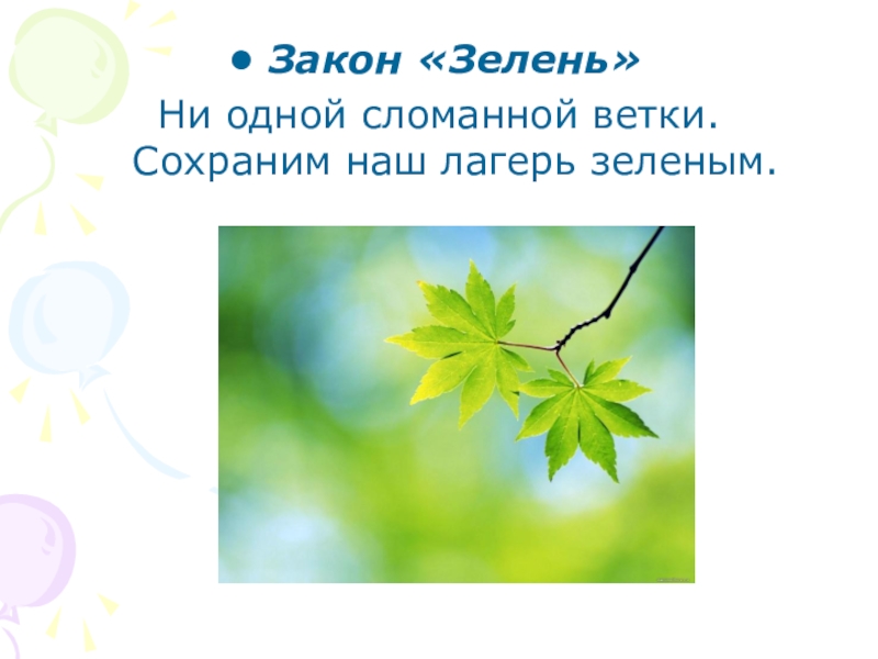 Закон «Зелень»Ни одной сломанной ветки. Сохраним наш лагерь зеленым.