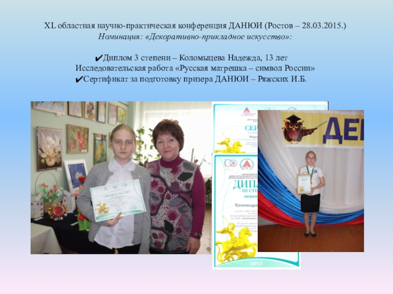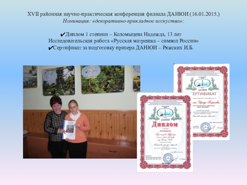 XVII районная научно-практическая конференция филиала ДАНЮИ (2015.): 1 место.