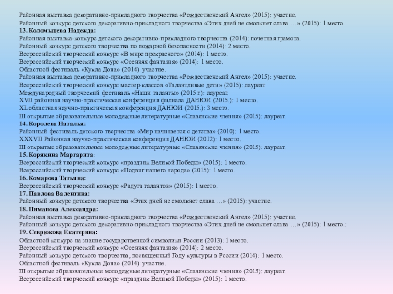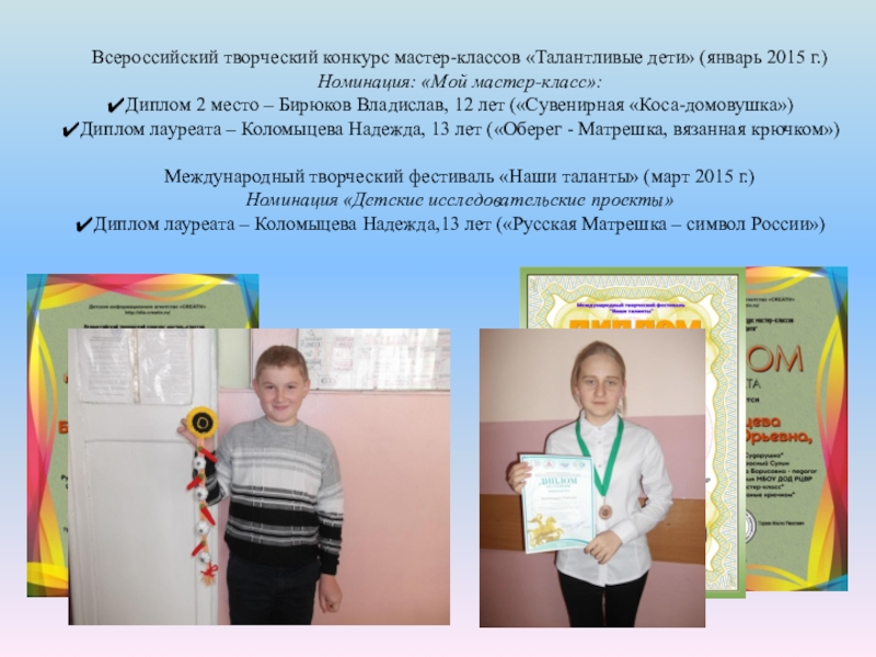 Всероссийский творческий конкурс мастер-классов «Талантливые дети» (2015): лауреат
