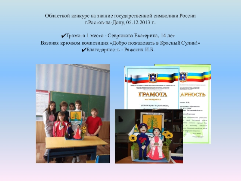 Областной конкурс на знание государственной символики России (2013): 1 место.