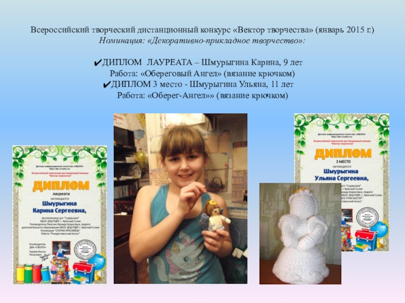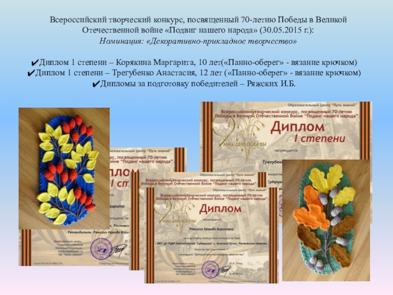 Диплом 1 степени – Трегубенко Анастасия, 12 лет («Панно-оберег» - вязание крючком)