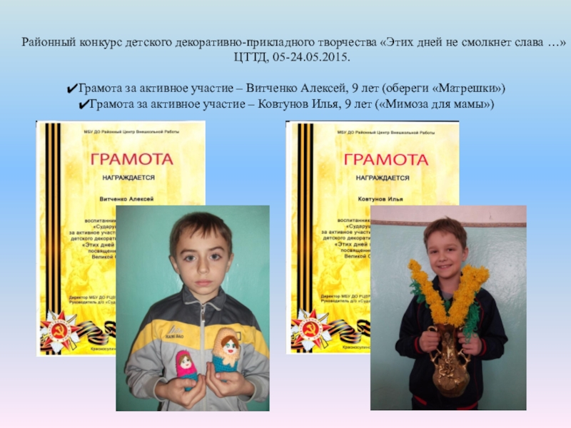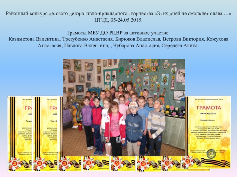 Районный конкурс детского декоративно-прикладного творчества «Этих дней не смолкнет слава …» (2015): участие.