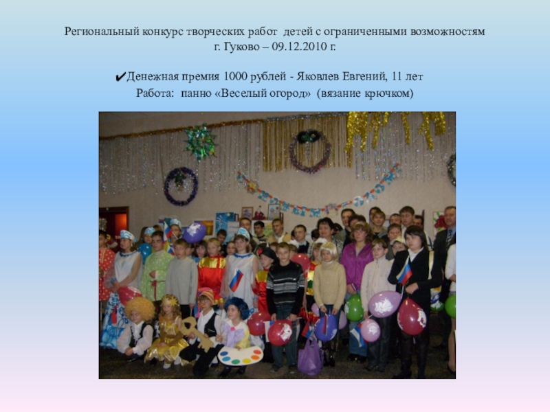 Региональный конкурс творческих работ детей с ограниченными возможностям (2010): Денежная премия 1000 рублей.