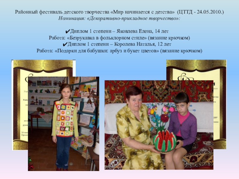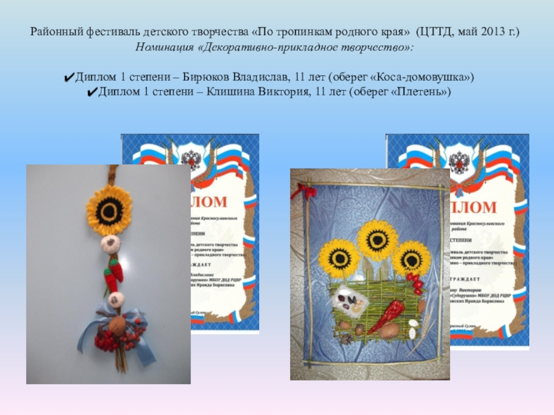 Районная выставка-конкурс детского декоративно-прикладного творчества (2014): 1 место.
