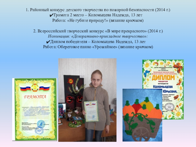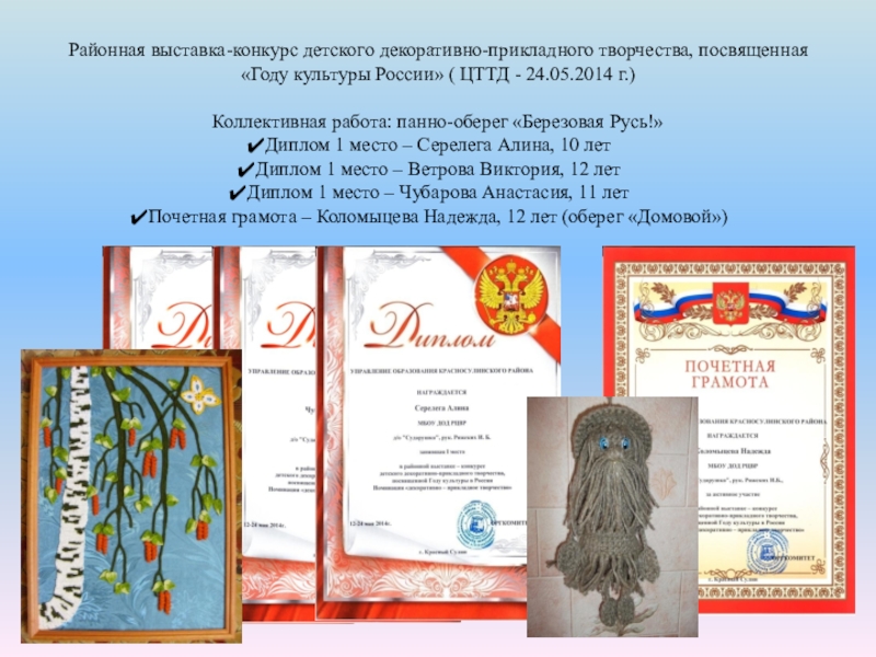 Районная выставка-конкурс детского декоративно-прикладного творчества (2014): почетная грамота.