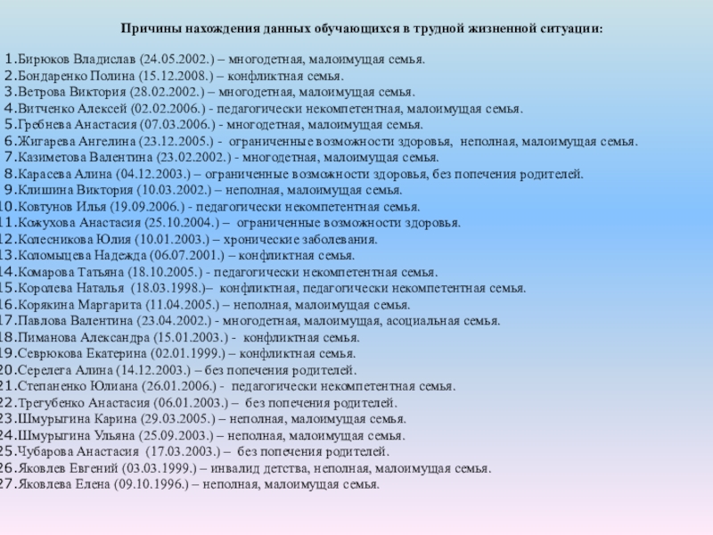 Павлова Валентина (23.04.2002.) - многодетная, малоимущая, асоциальная семья.