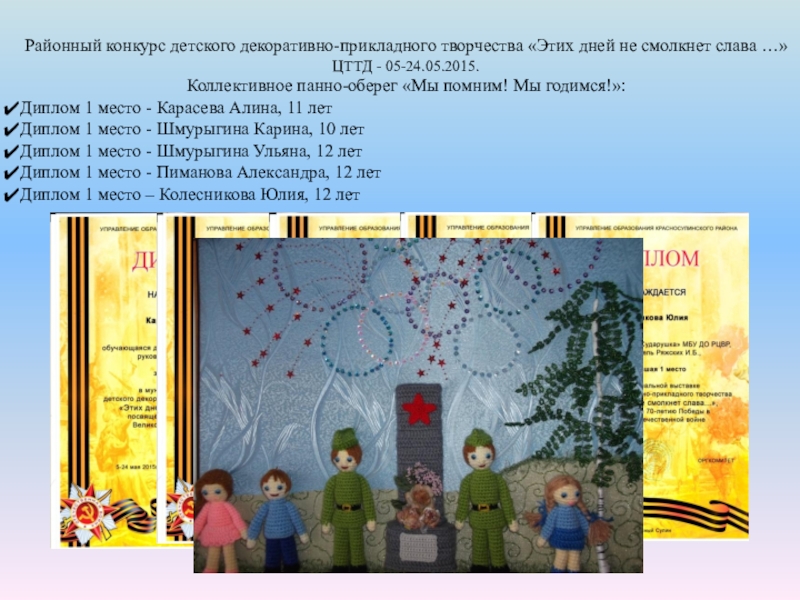 Районный конкурс детского декоративно-прикладного творчества «Этих дней не смолкнет слава …» (2015): 1 место.: