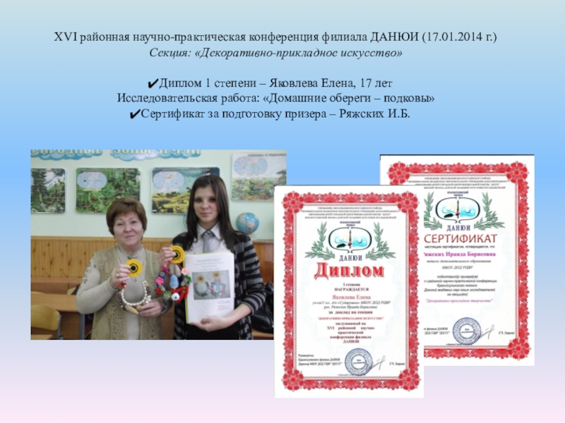 XVI районная научно-практическая конференция филиала ДАНЮИ (2014): 1 место.