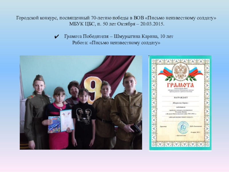 Слайд 31Городской конкурс, посвященный 70-летию победы в ВОВ «Письмо неизвестному солдату»