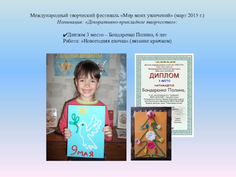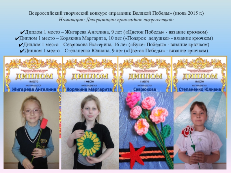 Диплом 1 место – Степаненко Юлиана, 9 лет («Цветок Победы» - вязание крючком)