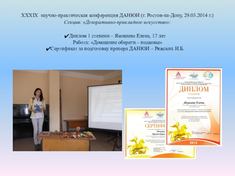 XXXIX областная научно-практическая конференция ДАНЮИ (2014): 1 место.