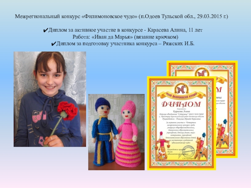 Диплом 2 место – Комарова Татьяна , 11 лет (оберег «Матрешка» – вязание крючком)