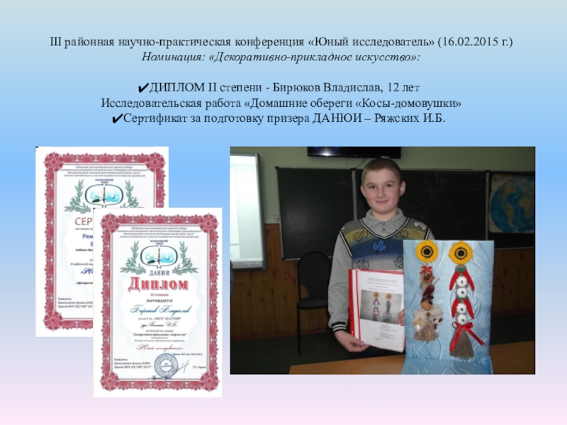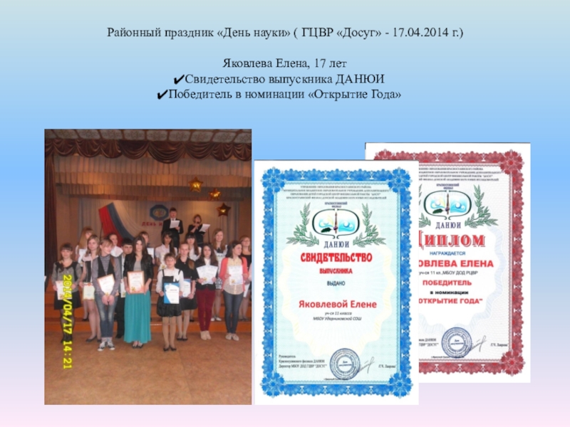Районный праздник «День науки» (2014): Победитель в номинации «Открытие Года», Свидетельство выпускника ДАНЮИ.