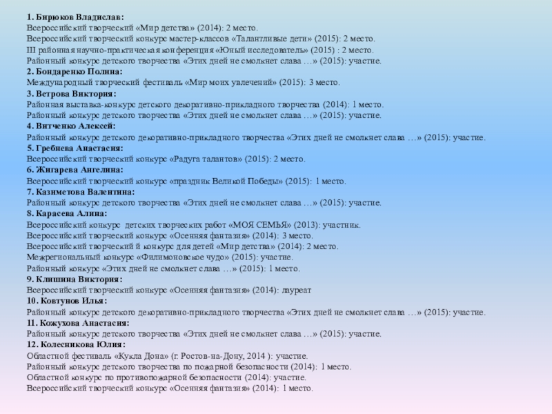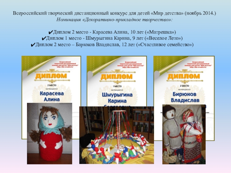 Всероссийский творческий й конкурс для детей «Мир детства» (2014): 2 место.