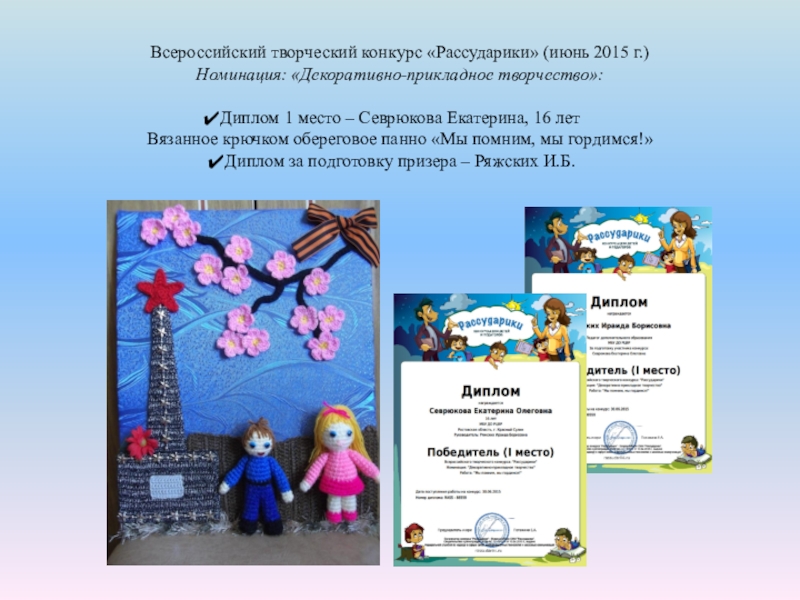 Диплом 1 место – Севрюкова Екатерина, 16 лет («Букет Победы» - вязание крючком)