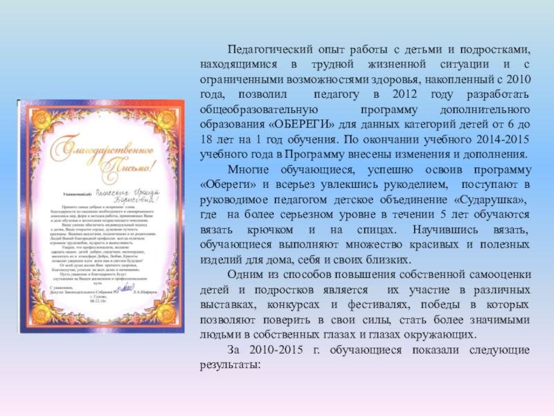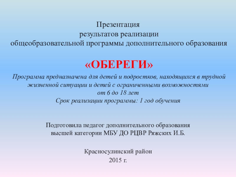 ситуации и с ограниченными возможностями здоровья, накопленный с 2010 года, позволил педагогу в 2012 году разработать общеобразовательную программу дополнительного образования «ОБЕРЕГИ» для данных категорий детей от 6 до 18 лет на 1 год обучения. По окончании учебного 2014-2015 учебного года в Программу внесены изменения и дополнения.