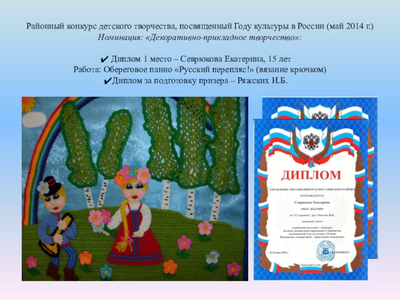 Районный конкурс детского творчества, посвященный Году культуры в России (2014): 1 место.