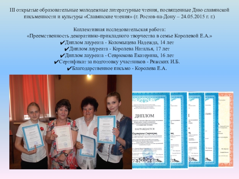 III открытые образовательные молодежные литературные «Славянские чтения» (2015): лауреат.