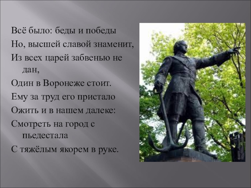 Всё было: беды и победыНо, высшей славой знаменит,Из всех царей забвенью не дан,Один в Воронеже стоит.Ему за