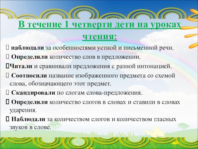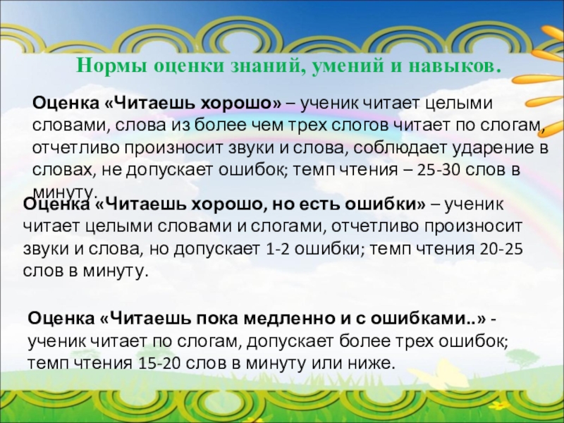 Оценка «Читаешь хорошо, но есть ошибки» – ученик читает целыми словами и слогами, отчетливо произносит звуки и слова, но допускает 1-2 ошибки; темп чтения 20-25 слов в минуту.