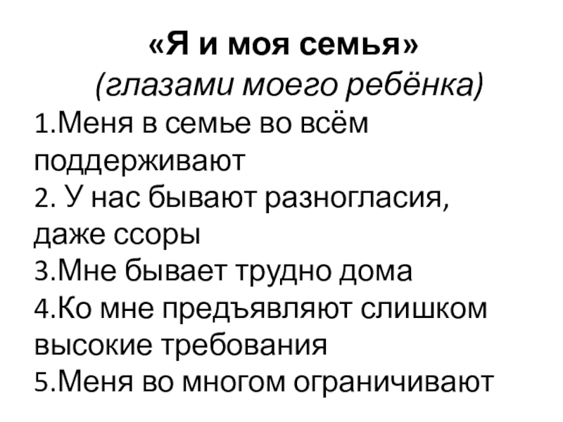 семья» (глазами моего ребёнка) 1.Меня в семье во всём поддерживают 2. У нас бывают разногласия, даже ссоры 3.Мне бывает трудно дома 4.Ко мне предъявляют слишком высокие требования 5.Меня во многом ограничивают