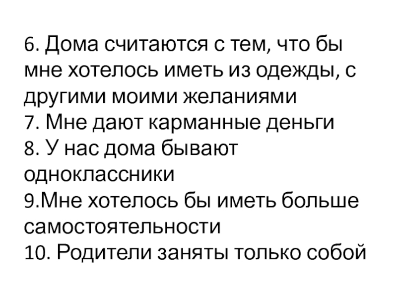 одежды, с другими моими желаниями 7. Мне дают карманные деньги 8. У нас дома бывают одноклассники 9.Мне хотелось бы иметь больше самостоятельности 10. Родители заняты только собой