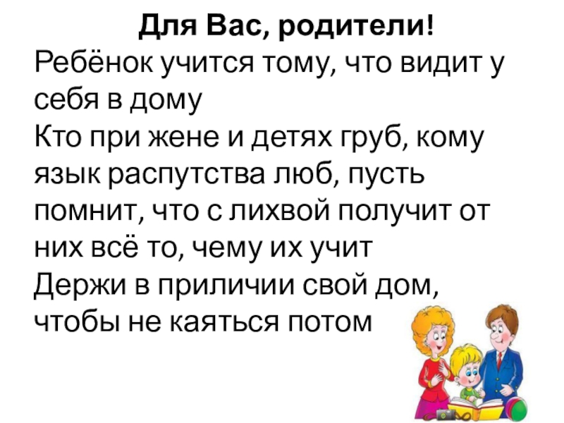 учится тому, что видит у себя в дому Кто при жене и детях груб, кому язык распутства люб, пусть помнит, что с лихвой получит от них всё то, чему их учит Держи в приличии свой дом, чтобы не каяться потом