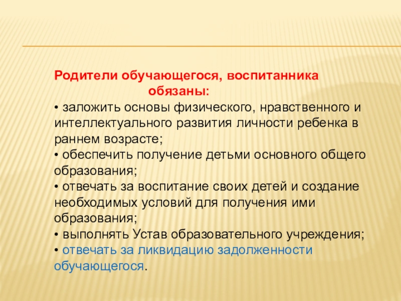 • отвечать за воспитание своих детей и создание необходимых условий для получения ими образования;