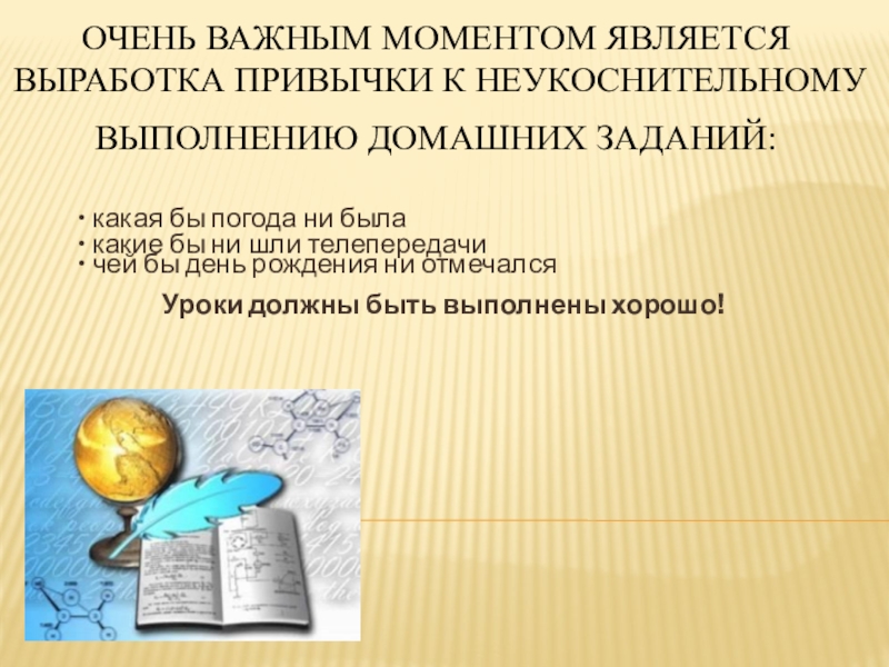Слайд 21Очень важным моментом является выработка привычки к неукоснительному выполнению домашних заданий: