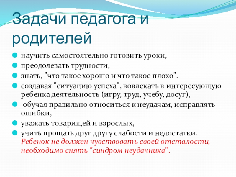 учить прощать друг другу слабости и недостатки. Ребенок не должен чувствовать своей отсталости, необходимо снять "синдром неудачника".