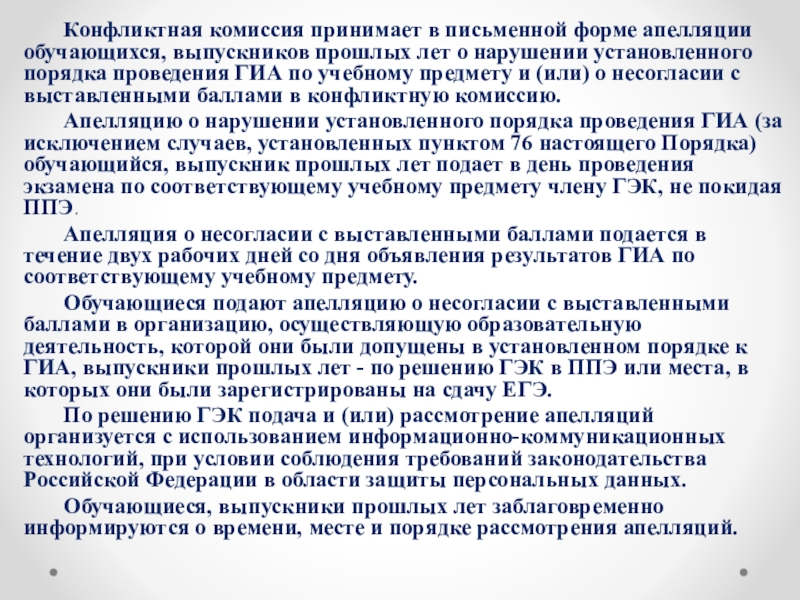 Слайд 20 Конфликтная комиссия принимает в письменной форме апелляции обучающихся, выпускников прошлых лет