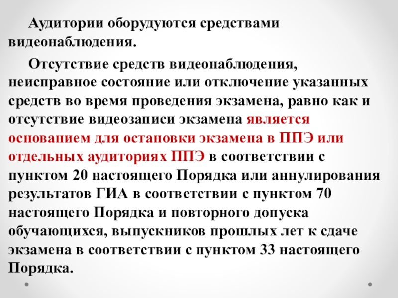 указанных средств во время проведения экзамена, равно как и отсутствие видеозаписи экзамена является основанием для остановки экзамена в ППЭ или отдельных аудиториях ППЭ в соответствии с пунктом 20 настоящего Порядка или аннулирования результатов ГИА в соответствии с пунктом 70 настоящего Порядка и повторного допуска обучающихся, выпускников прошлых лет к сдаче экзамена в соответствии с пунктом 33 настоящего Порядка.