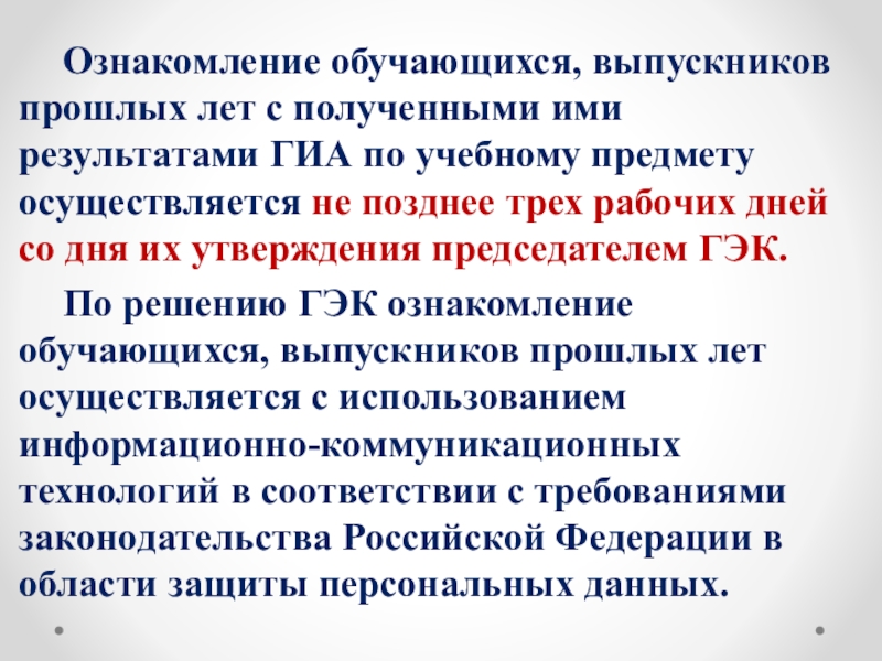 По решению ГЭК ознакомление обучающихся, выпускников прошлых лет осуществляется с использованием информационно-коммуникационных технологий в соответствии с требованиями законодательства Российской Федерации в области защиты персональных данных.