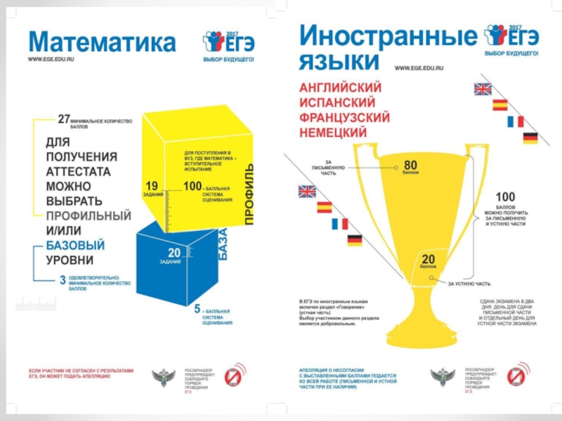 ЕГЭ по двум предметам (русский язык и математика) обязательны для выпускников ОУ. Условие получения аттестата о среднем (полном) общем образовании - успешное прохождение ЕГЭ по русскому языку и математике базового уровня.