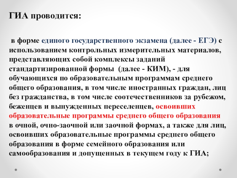 использованием контрольных измерительных материалов, представляющих собой комплексы заданий стандартизированной формы (далее - КИМ), - для обучающихся по образовательным программам среднего общего образования, в том числе иностранных граждан, лиц без гражданства, в том числе соотечественников за рубежом, беженцев и вынужденных переселенцев, освоивших образовательные программы среднего общего образования в очной, очно-заочной или заочной формах, а также для лиц, освоивших образовательные программы среднего общего образования в форме семейного образования или самообразования и допущенных в текущем году к ГИА;