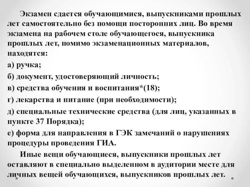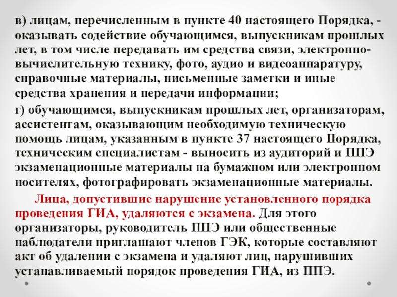 г) обучающимся, выпускникам прошлых лет, организаторам, ассистентам, оказывающим необходимую техническую помощь лицам, указанным в пункте 37 настоящего Порядка, техническим специалистам - выносить из аудиторий и ППЭ экзаменационные материалы на бумажном или электронном носителях, фотографировать экзаменационные материалы.