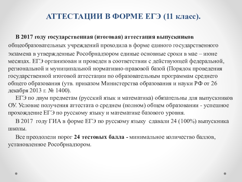 экзамена в утвержденные Рособрнадзором единые основные сроки в мае – июне месяцах. ЕГЭ организован и проведен в соответствии с действующей федеральной, региональной и муниципальной нормативно-правовой базой (Порядок проведения государственной итоговой аттестации по образовательным программам среднего общего образования (утв. приказом Министерства образования и науки РФ от 26 декабря 2013 г. № 1400).