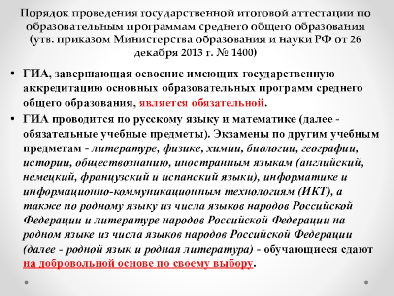 ГИА проводится по русскому языку и математике (далее - обязательные учебные предметы). Экзамены по другим учебным предметам - литературе, физике, химии, биологии, географии, истории, обществознанию, иностранным языкам (английский, немецкий, французский и испанский языки), информатике и информационно-коммуникационным технологиям (ИКТ), а также по родному языку из числа языков народов Российской Федерации и литературе народов Российской Федерации на родном языке из числа языков народов Российской Федерации (далее - родной язык и родная литература) - обучающиеся сдают на добровольной основе по своему выбору.