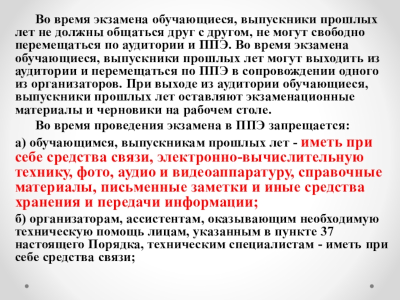 обучающимся, выпускникам прошлых лет, в том числе передавать им средства связи, электронно-вычислительную технику, фото, аудио и видеоаппаратуру, справочные материалы, письменные заметки и иные средства хранения и передачи информации;