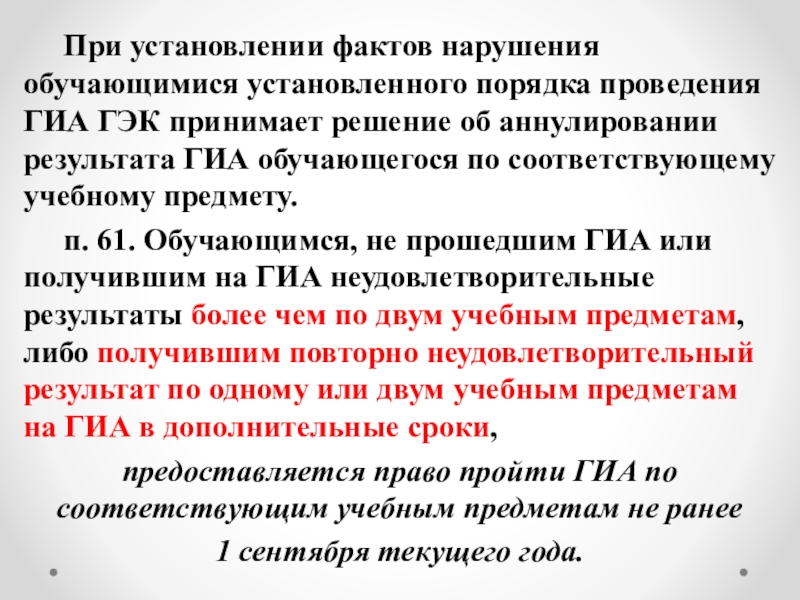 Слайд 15 При установлении фактов нарушения обучающимися установленного порядка проведения ГИА ГЭК принимает