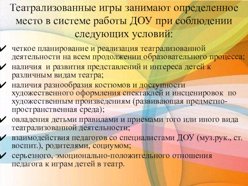 четкое планирование и реализация театрализованной деятельности на всем продолжении образовательного процесса;