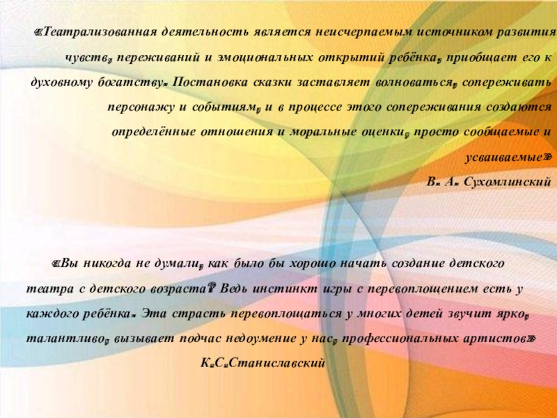 «Вы никогда не думали, как было бы хорошо начать создание детского театра с детского возраста? Ведь инстинкт игры с перевоплощением есть у каждого ребёнка. Эта страсть перевоплощаться у многих детей звучит ярко, талантливо, вызывает подчас недоумение у нас, профессиональных артистов» К.С.Станиславский