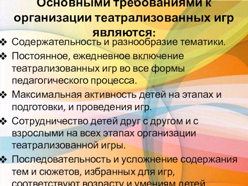 овладения детьми правилами и приемами того или иного вида театрализованной деятельности;