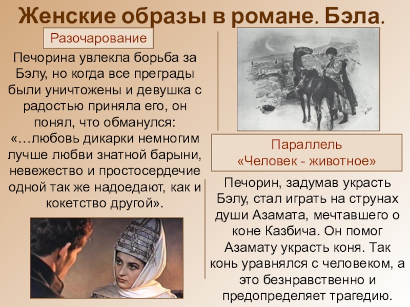Печорин, задумав украсть Бэлу, стал играть на струнах души Азамата, мечтавшего о коне Казбича. Он помог Азамату украсть коня. Так конь уравнялся с человеком, а это безнравственно и предопределяет трагедию.