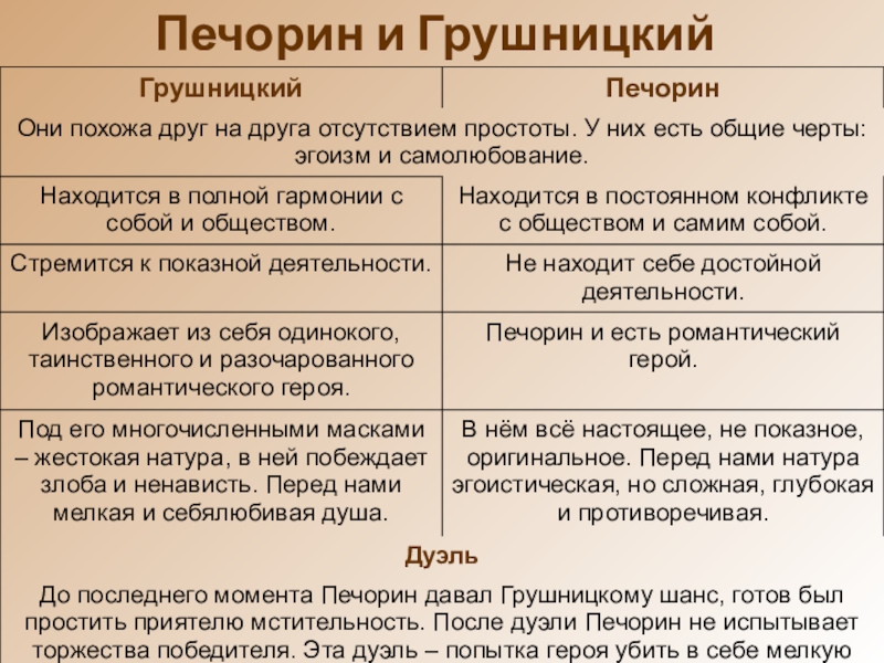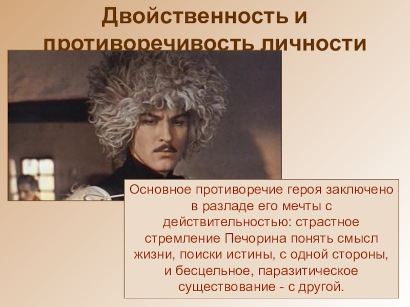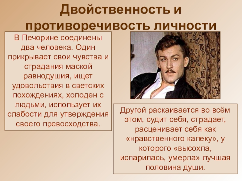 В Печорине соединены два человека. Один прикрывает свои чувства и страдания маской равнодушия, ищет удовольствия в светских похождениях, холоден с людьми, использует их слабости для утверждения своего превосходства.