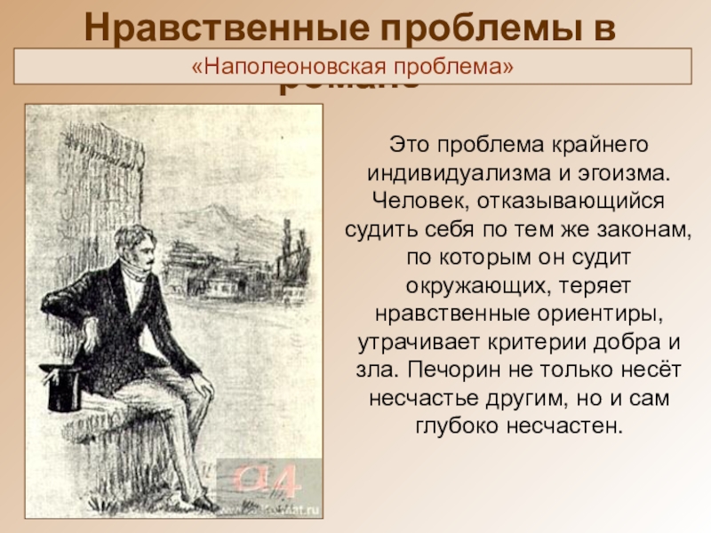 судить себя по тем же законам, по которым он судит окружающих, теряет нравственные ориентиры, утрачивает критерии добра и зла. Печорин не только несёт несчастье другим, но и сам глубоко несчастен.