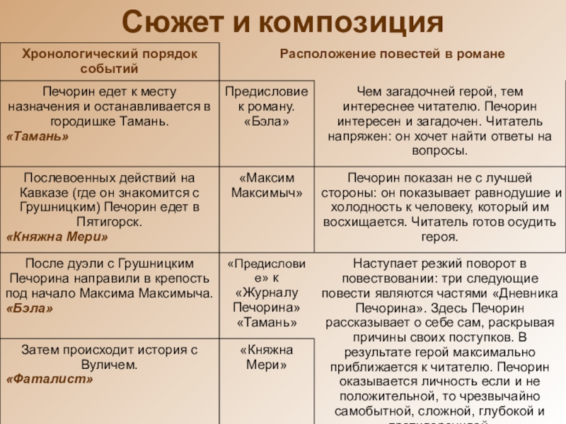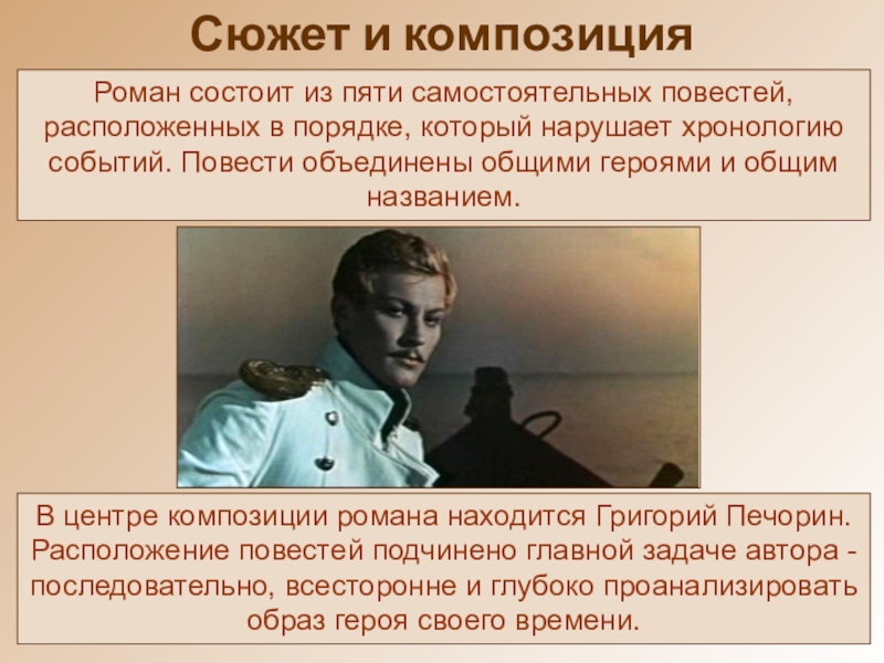 В центре композиции романа находится Григорий Печорин. Расположение повестей подчинено главной задаче автора - последовательно, всесторонне и глубоко проанализировать образ героя своего времени.