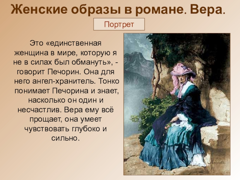 не в силах был обмануть», - говорит Печорин. Она для него ангел-хранитель. Тонко понимает Печорина и знает, насколько он один и несчастлив. Вера ему всё прощает, она умеет чувствовать глубоко и сильно.